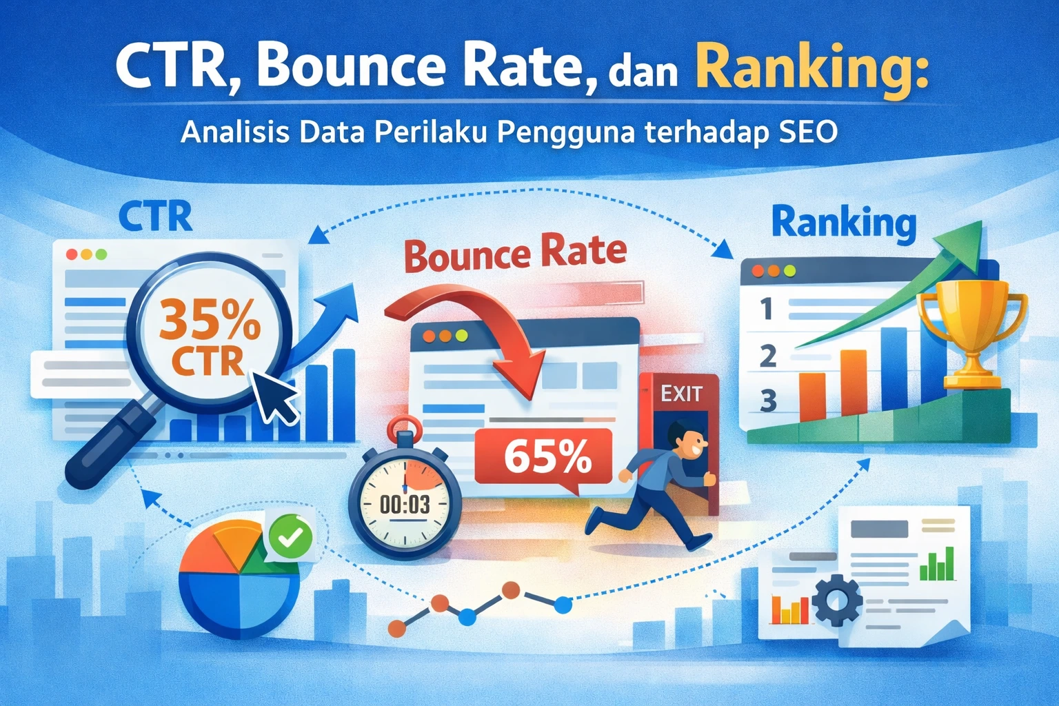 CTR, bounce rate, dan ranking membentuk sebuah siklus. Ranking menentukan visibilitas, CTR menentukan minat, dan bounce rate menunjukkan kepuasan.